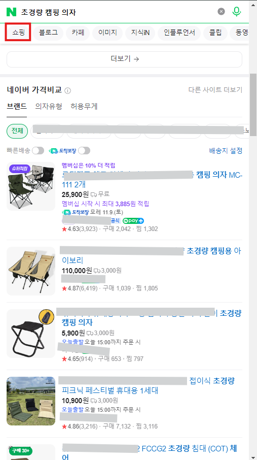 예를 들어, 통합검색창에서 ‘캠핑 의자’로 검색한다고 해봅시다. ‘초경량 캠핑 의자’로 세부 키워드를 썼을 때 상품 수가 확 줄죠? 하지만 바로 상품을 올리기 전에, 쇼핑 탭에 상품이 제대로 노출되는지 꼭 확인하세요.